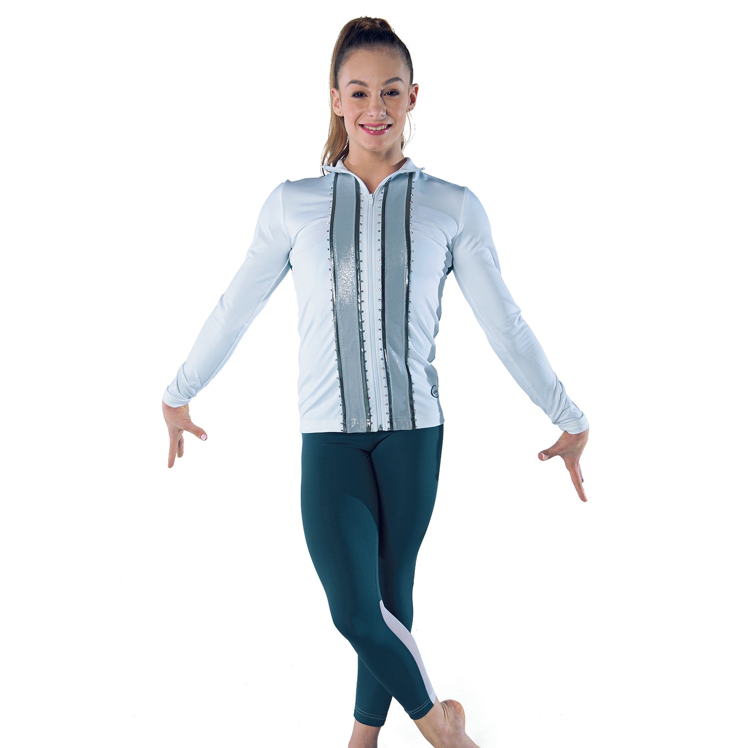 Custom warm up jacket available in all fabric colors on the OZONE fabric chart. Embellish with sequin or crystal. Custom color leggings with lower back leg mesh panels available in all fabric colors on the OZONE fabric chart.