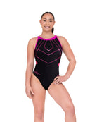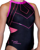 Step into the spotlight in Maddie William's Prism Dream leotard from the Bold Passion Collection. Sublimated in striking black and neon pink, this design features misty pink trim and bold back straps. Abstract pink accents shimmer across the front with hot pink spangles, while neon mesh side cutouts add a daring edge to this radiant look.