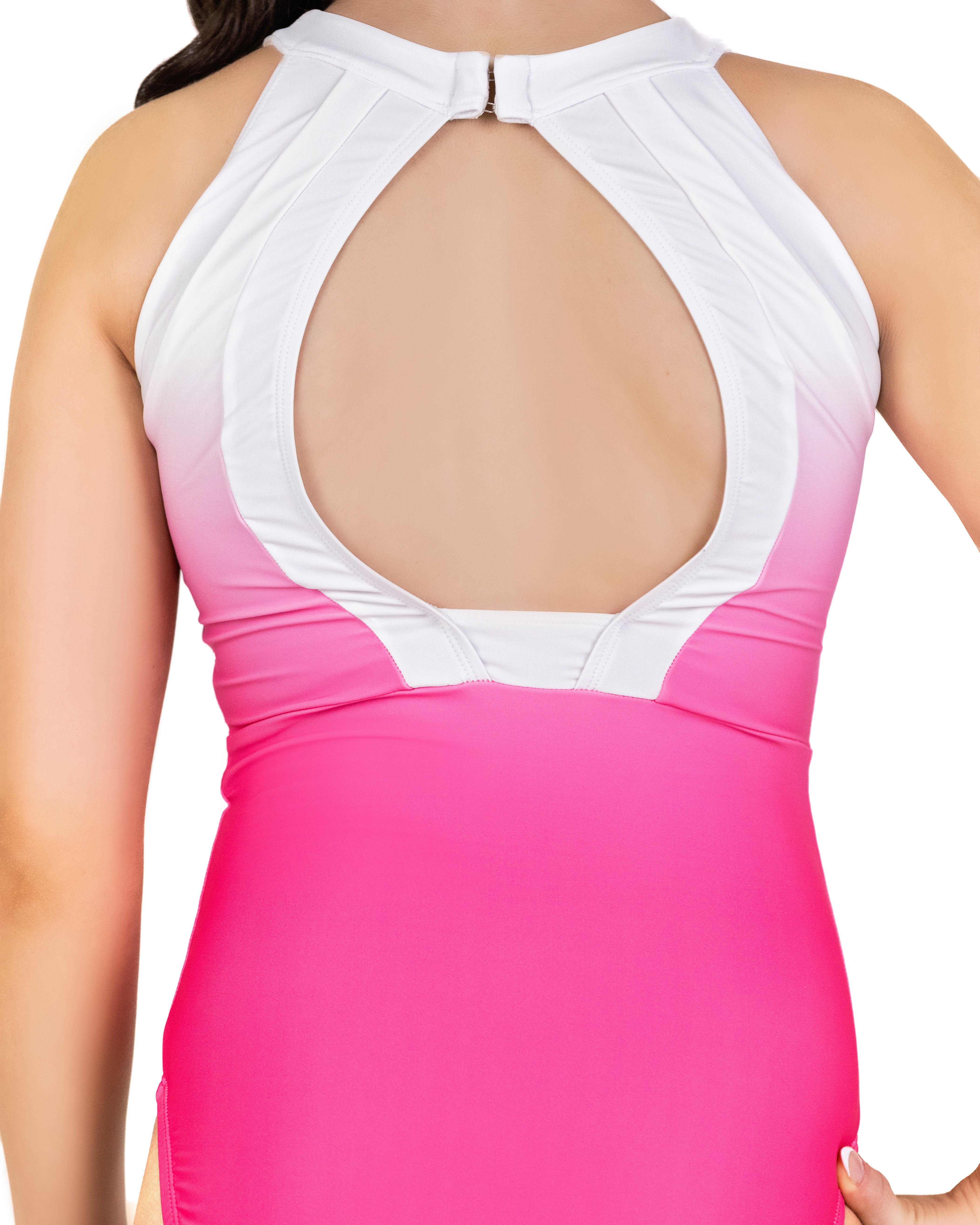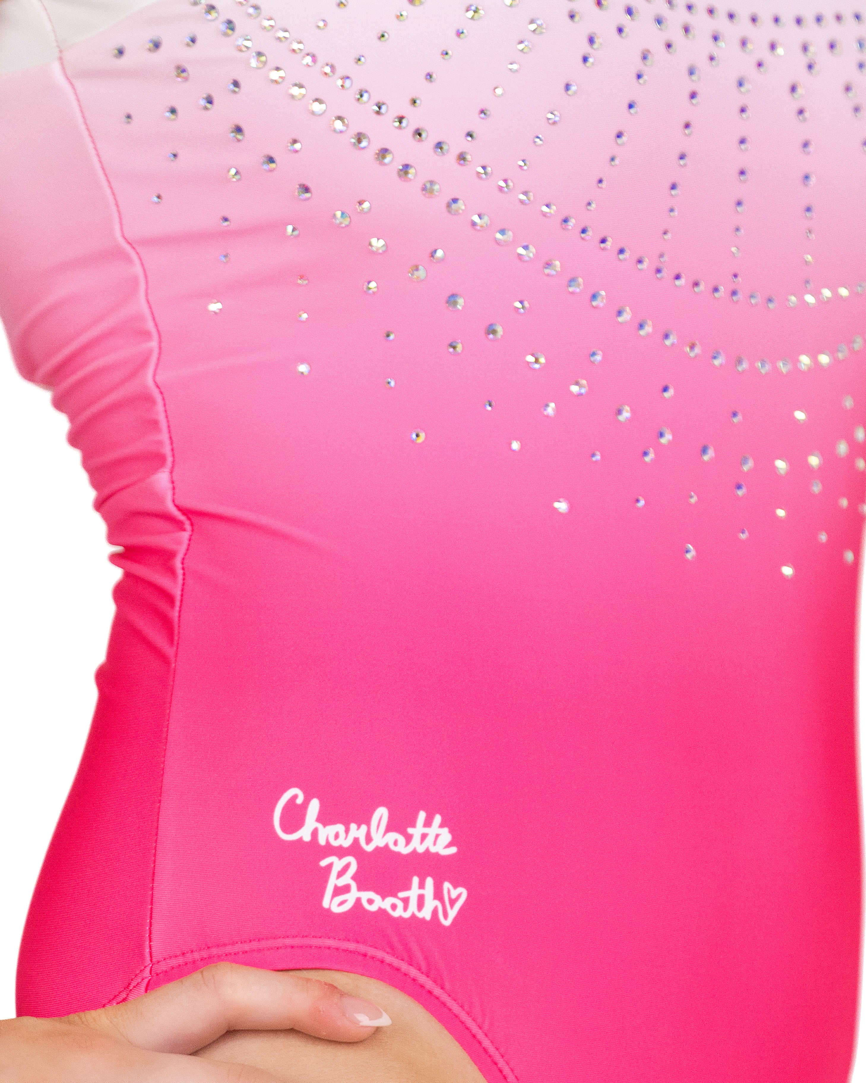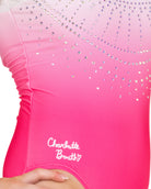 Elegant and refined, Unfolding Grace by Charlotte Booth captures softness with a striking finish. A strawberry pink base fades to white at the neckline, framed with crisp white nylon trim and an open back. The front shimmers with iridescent crystals arranged like layered strands of a necklace. Designed to move beautifully, this leo blends grace, light, and performance.